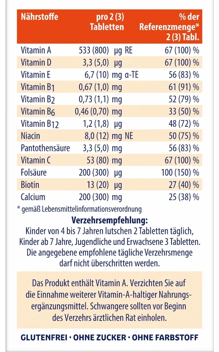 این مکمل حاوی ترکیبی از ویتامین ها و کلسیم است. پاستیل ها بدون قند و گلوتن هستند.
