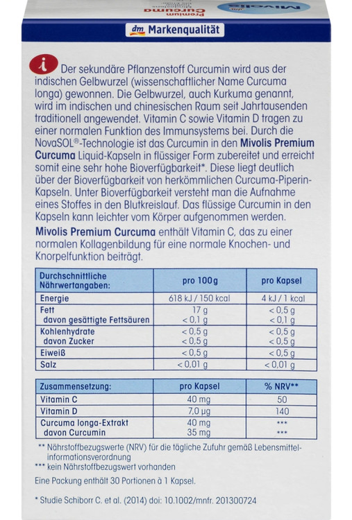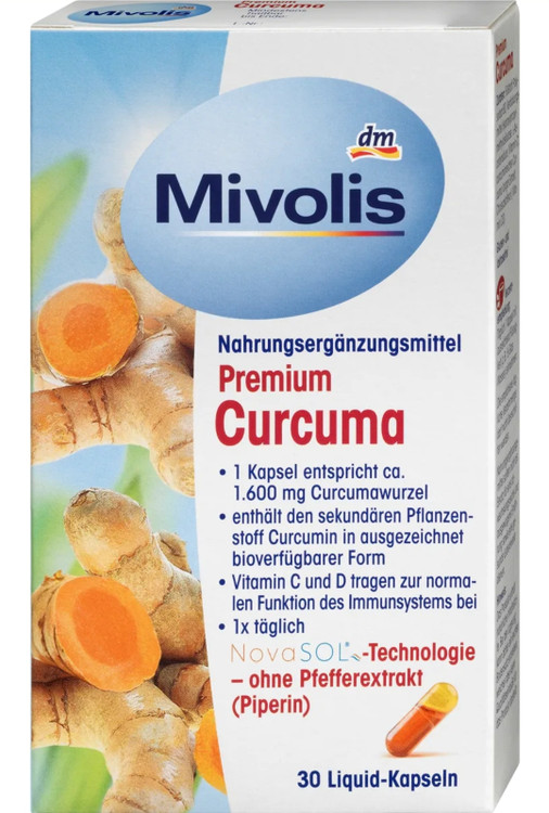 ماده گیاهی کورکومین از ریشه زردچوبه هندی (با نام علمی Curcuma longa) استخراج میشود. زردچوبه به طور سنتی هزاران سال است که در هند و چین مورد استفاده قرار میگیرد. ویتامین C و ویتامین D به عملکرد طبیعی سیستم ایمنی بدن کمک میکنند. به لطف فناوری NovaSOL®، کورکومین موجود در کپسولهای Mivolis Premium Curcuma Liquid به صورت مایع تهیه میشود، بنابراین فراهمی زیستی بسیار بالایی را به دست میآورد. کورکومین مایع موجود در کپسولها به راحتی توسط بدن جذب میشود. Mivolis Premium Curcuma حاوی ویتامین C است که به تشکیل کلاژن طبیعی برای عملکرد طبیعی استخوان و غضروف کمک می کند.